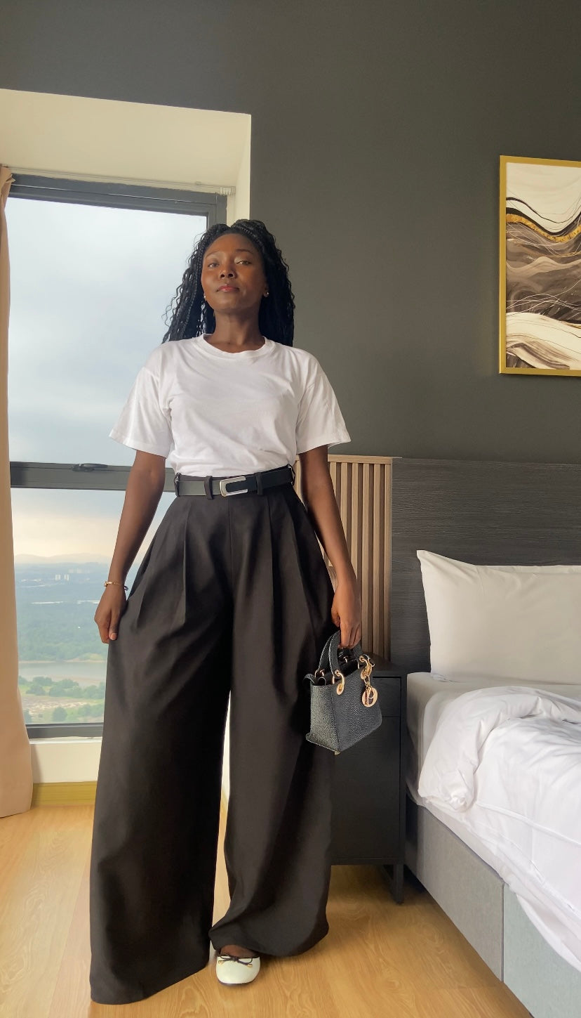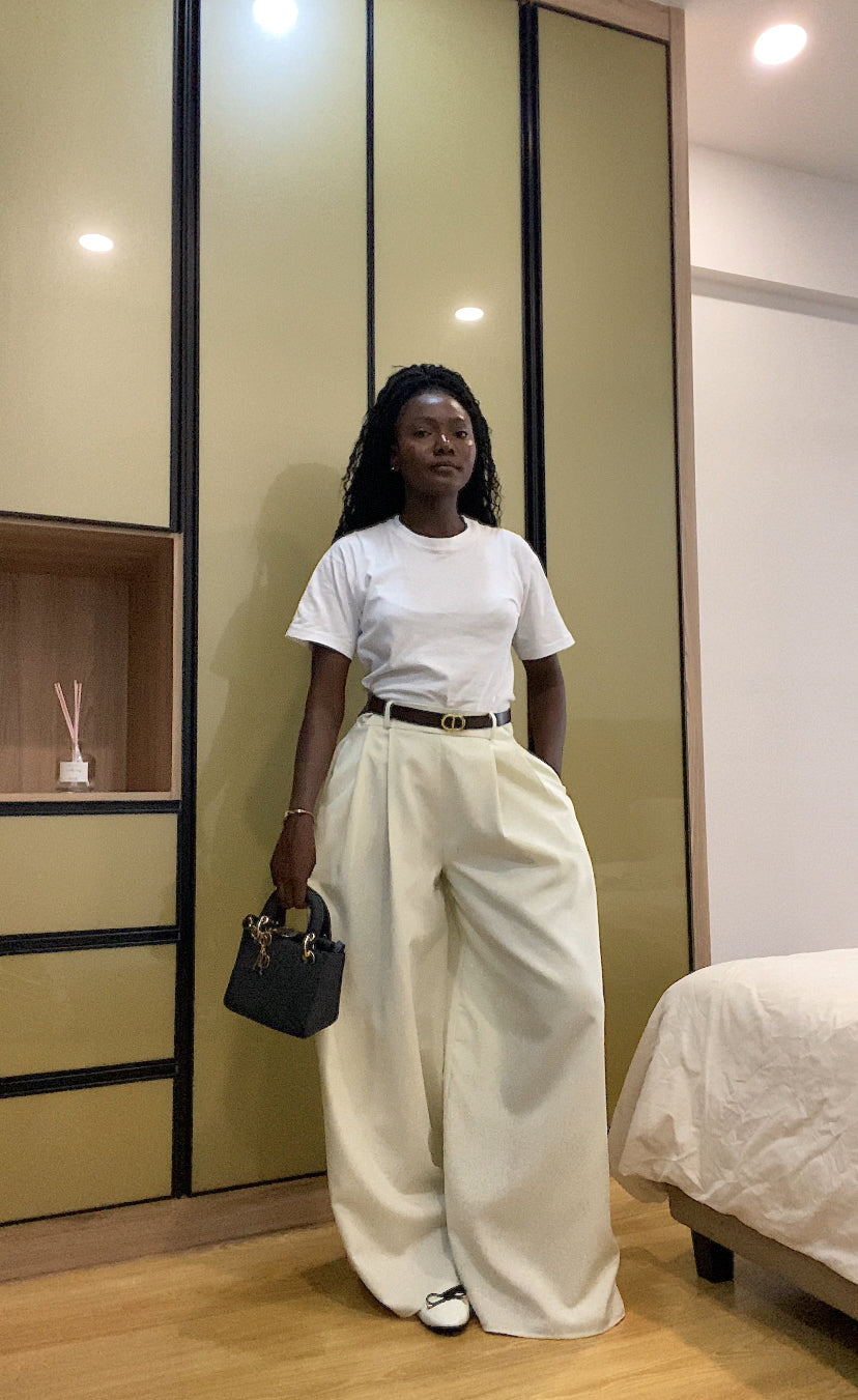 Structured yet breathable, these wide-leg classics are designed to do it all—from casual errands to elevated office looks. The high-waisted fit features discreet elastic at the back for comfort without compromising polish, while the belt loops and deep side pockets keep things functional and refined.