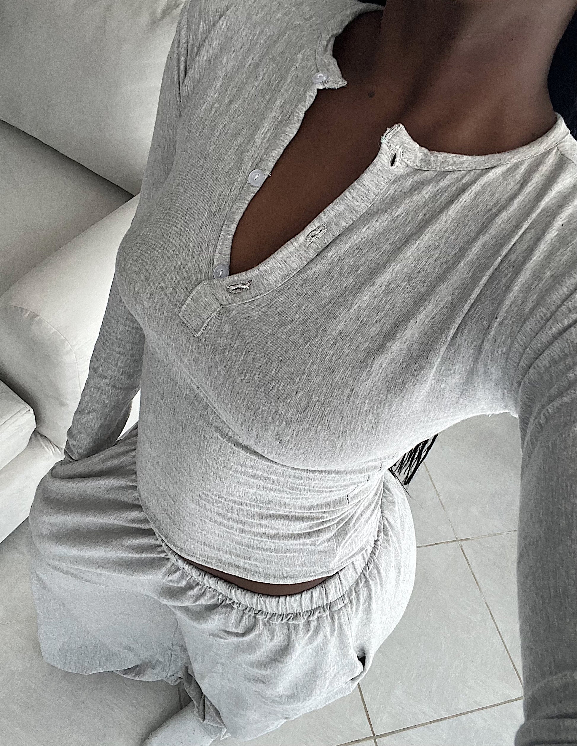 The Grey Core Comfort Button Front Top is crafted from soft, lightweight, stretchy cotton designed to move with you while gently hugging the body. Featuring a classic button-front detail, this top blends comfort with understated style. Breathable and flexible, it’s perfect for lounging at home, working from home, or stepping out for casual errands. Designed to be versatile, it pairs effortlessly with the Grey Core Comfort Pants or your favorite jeans for a relaxed yet put together look.