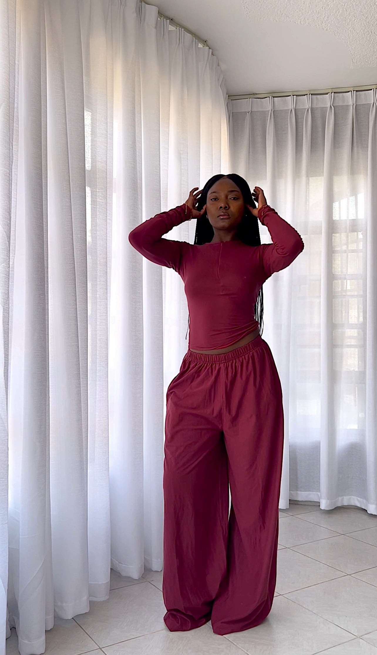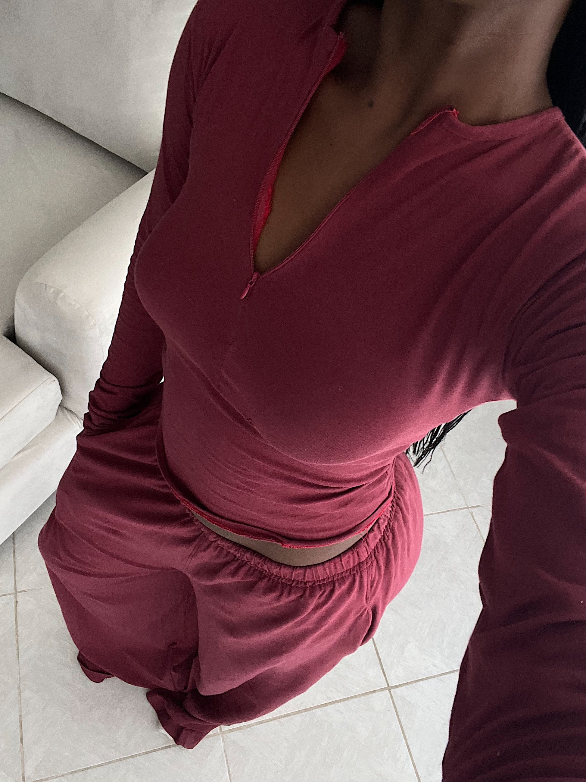 The Maroon Core Comfort Zip Front Top offers a modern, sleek take on everyday comfort. Made from light stretchy cotton, it contours the body while remaining breathable and lightweight. The front zipper adds a subtle edge and allows adjustable styling, making it easy to dress up or down. Ideal for lounging, casual outings, or working from home, this top transitions seamlessly into your everyday wardrobe and pairs beautifully with jeans, trousers, or the matching maroon Core Comfort Pants