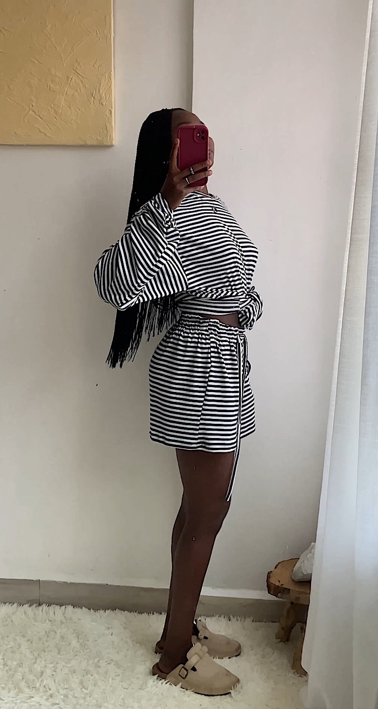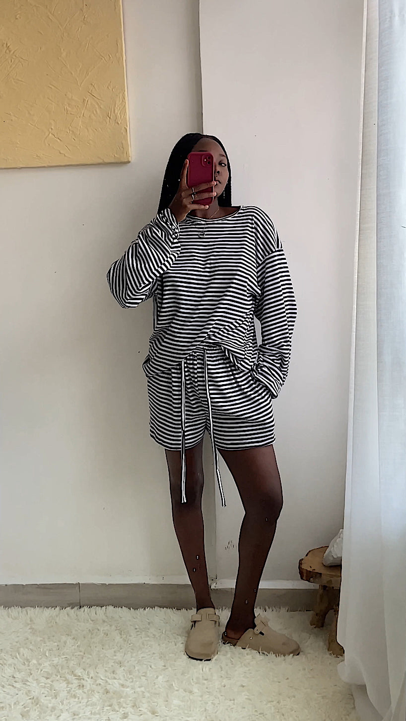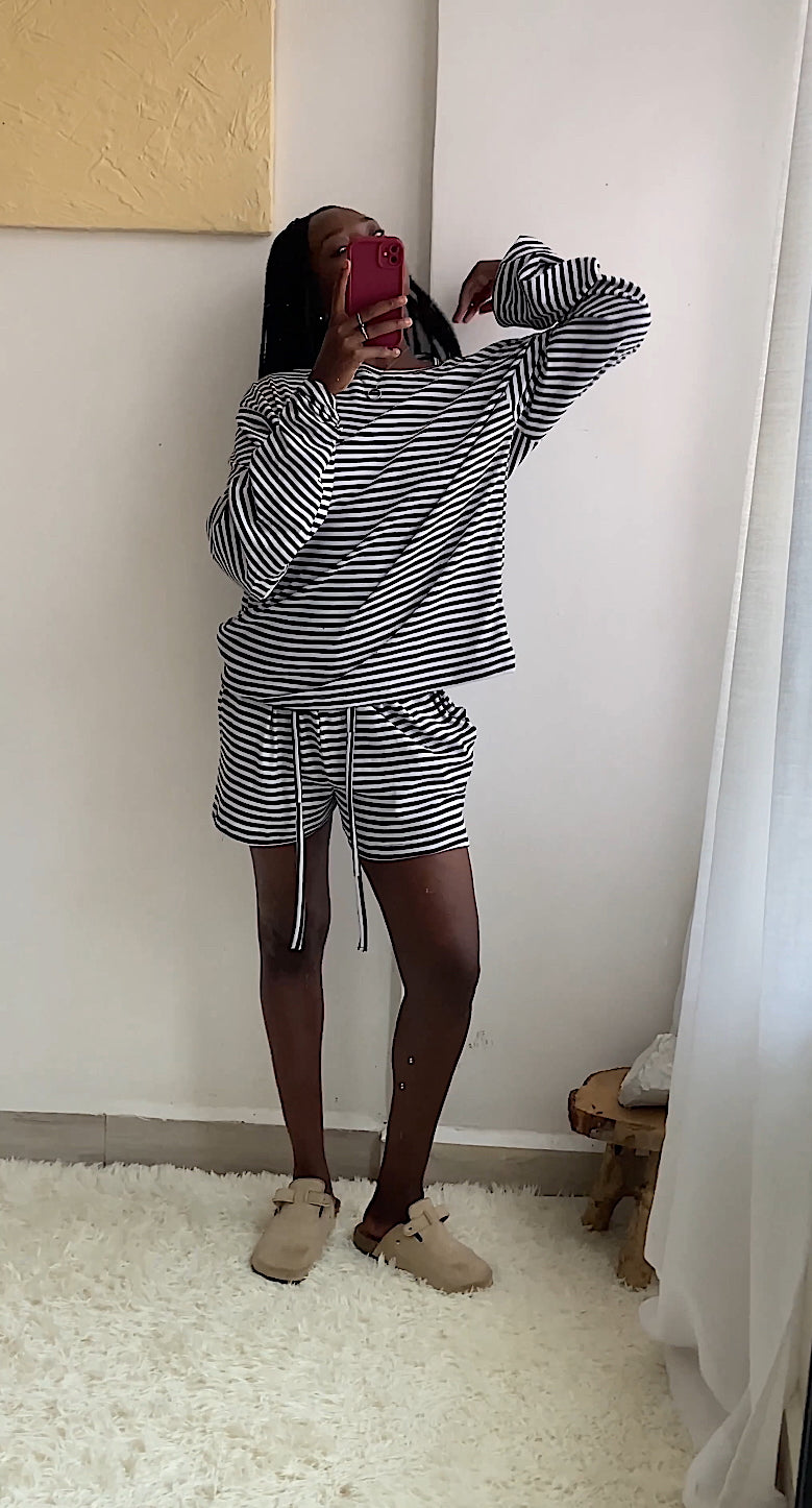 Pair with our Lounge Stripe Pants for a full-length or the lounge stripe shorts for a flowy set, or tuck it into denim, bike shorts, or a mini skirt. Add slides or sneakers and you’re done.
