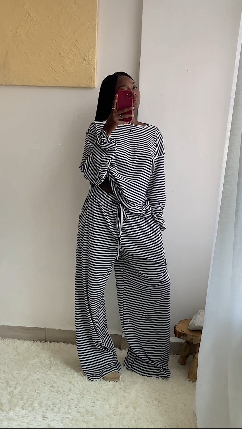 Our Lounge Stripe Pants are made from a ribbed, ultra-stretch fabric that moves with you. Designed with flow and comfort in mind, they feature an elastic waistband, two side pockets, and an extra-long, relaxed leg that drapes beautifully on all heights.