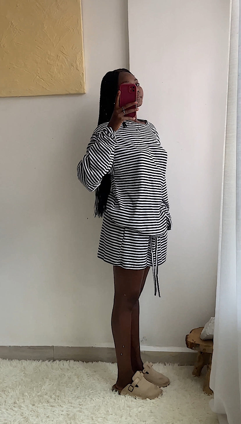 Our Lounge Stripe Shorts are made from a soft, ribbed stretch fabric that’s lightweight and breathable perfect for relaxed mornings, slow days, and casual errands. They’re high-waisted with an elastic waistband, adjustable drawstring, and side pockets for comfort that fits like second skin.