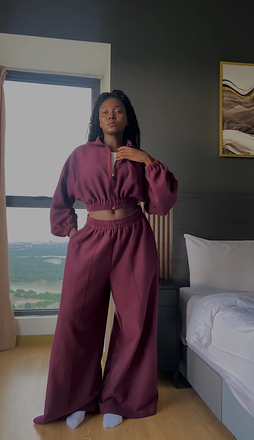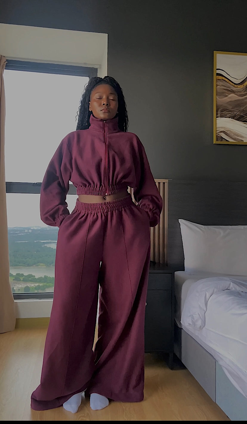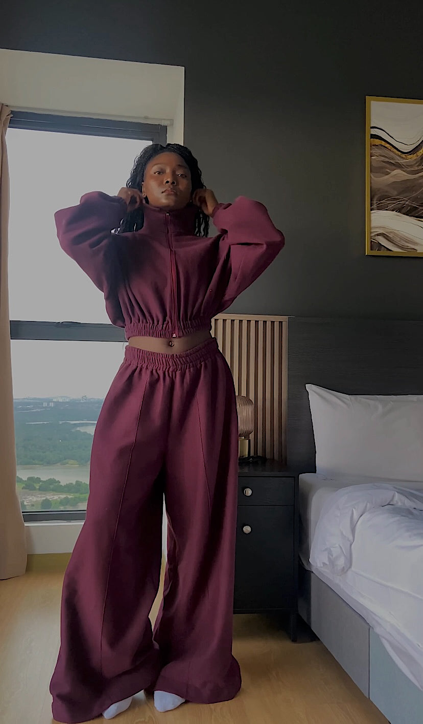 Our Maroon Zip- Up Jacket is Versatile, stylish, and effortlessly cool—this jacket is designed to transform your look in seconds. The adjustable zip-up front lets you switch between a high pull-neck design for a sleek, cozy feel or a collared look for a chic, laid-back vibe. The elastic waistband gives you control over the crop—wear it high for a bold statement or lower for a relaxed fit. Plus, the elastic cuffs create a subtle puffy sleeve effect, adding the perfect touch of structure and style.