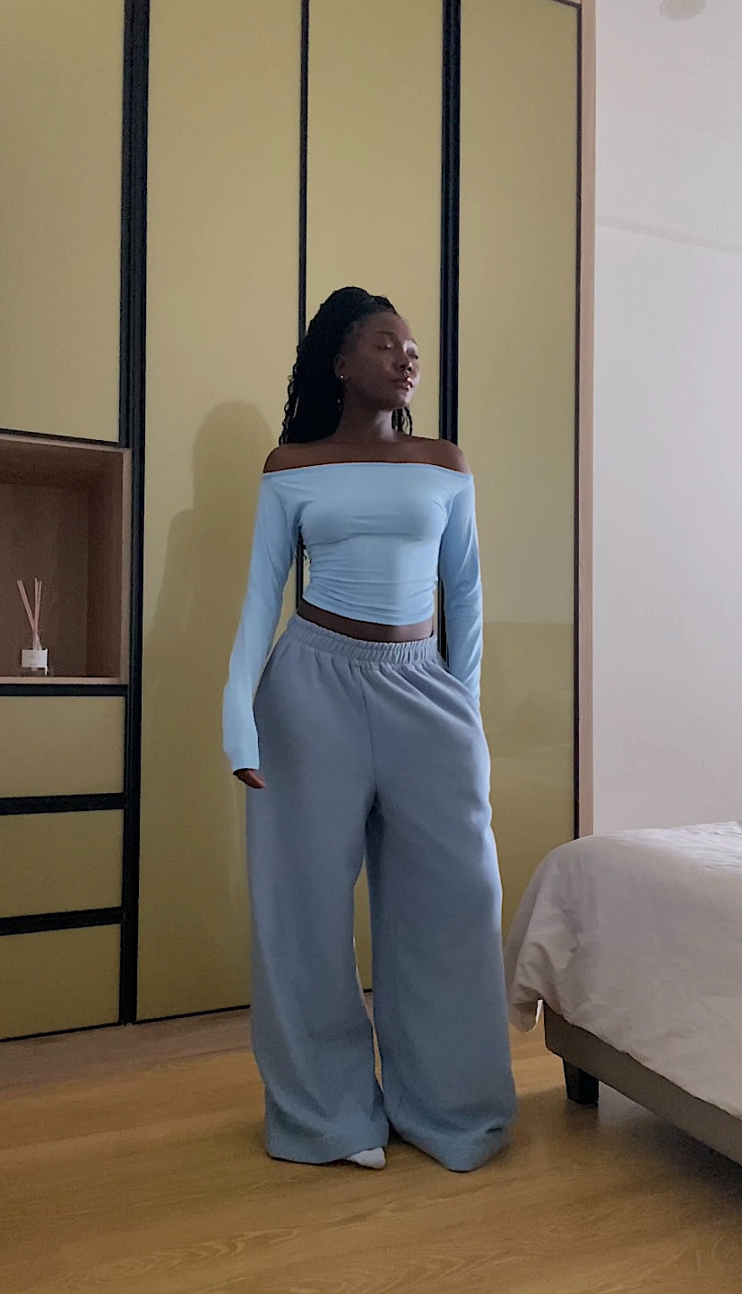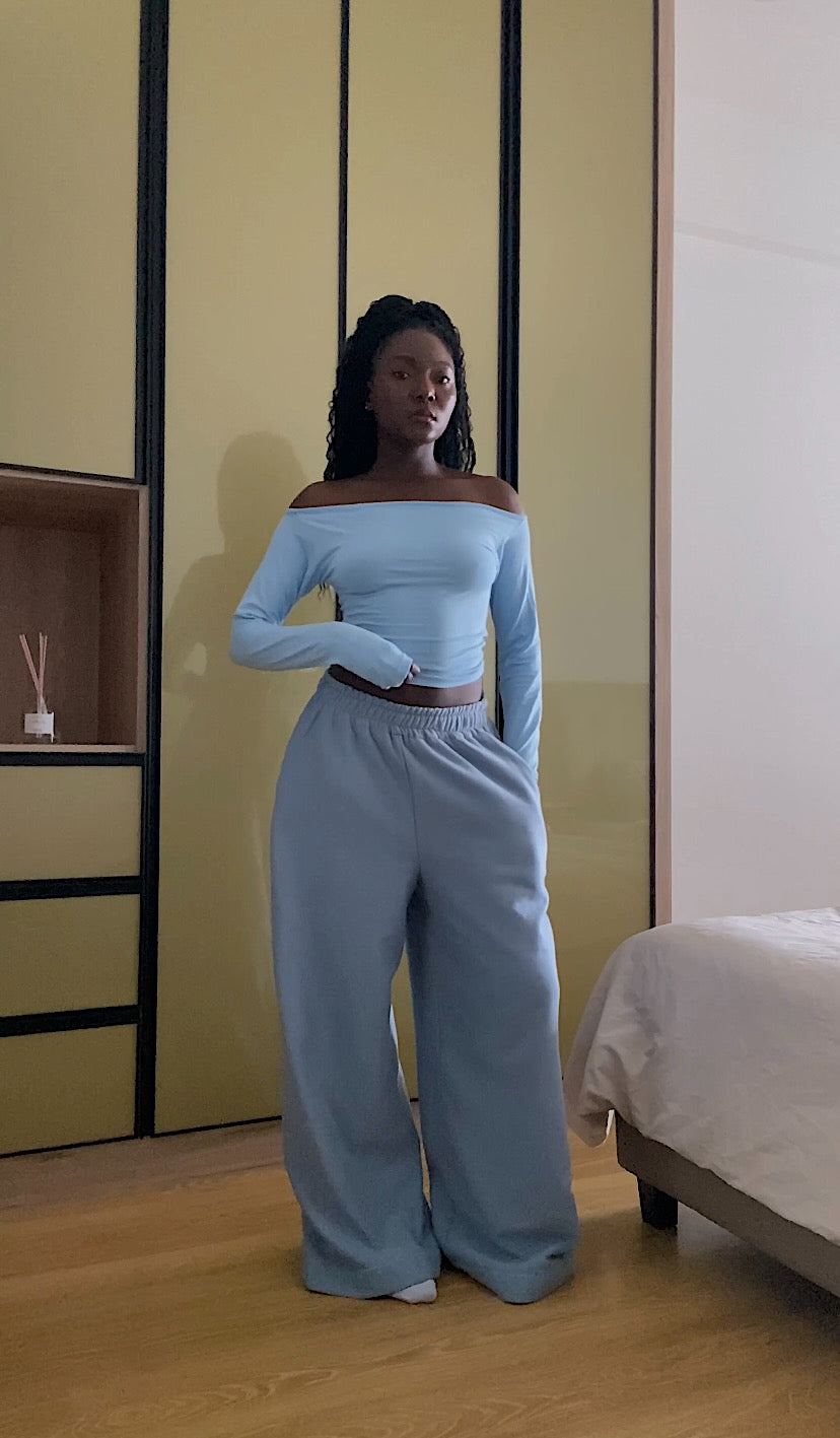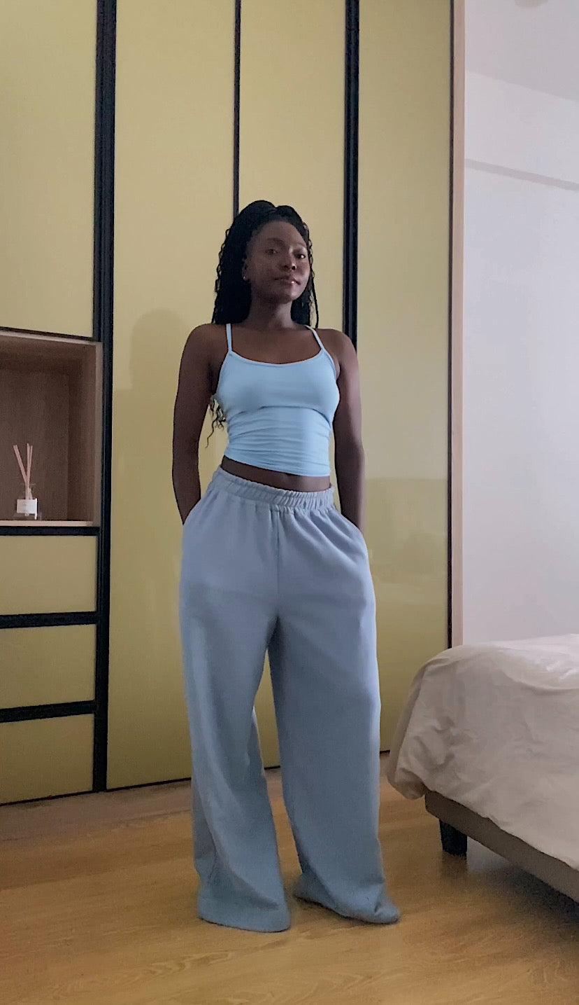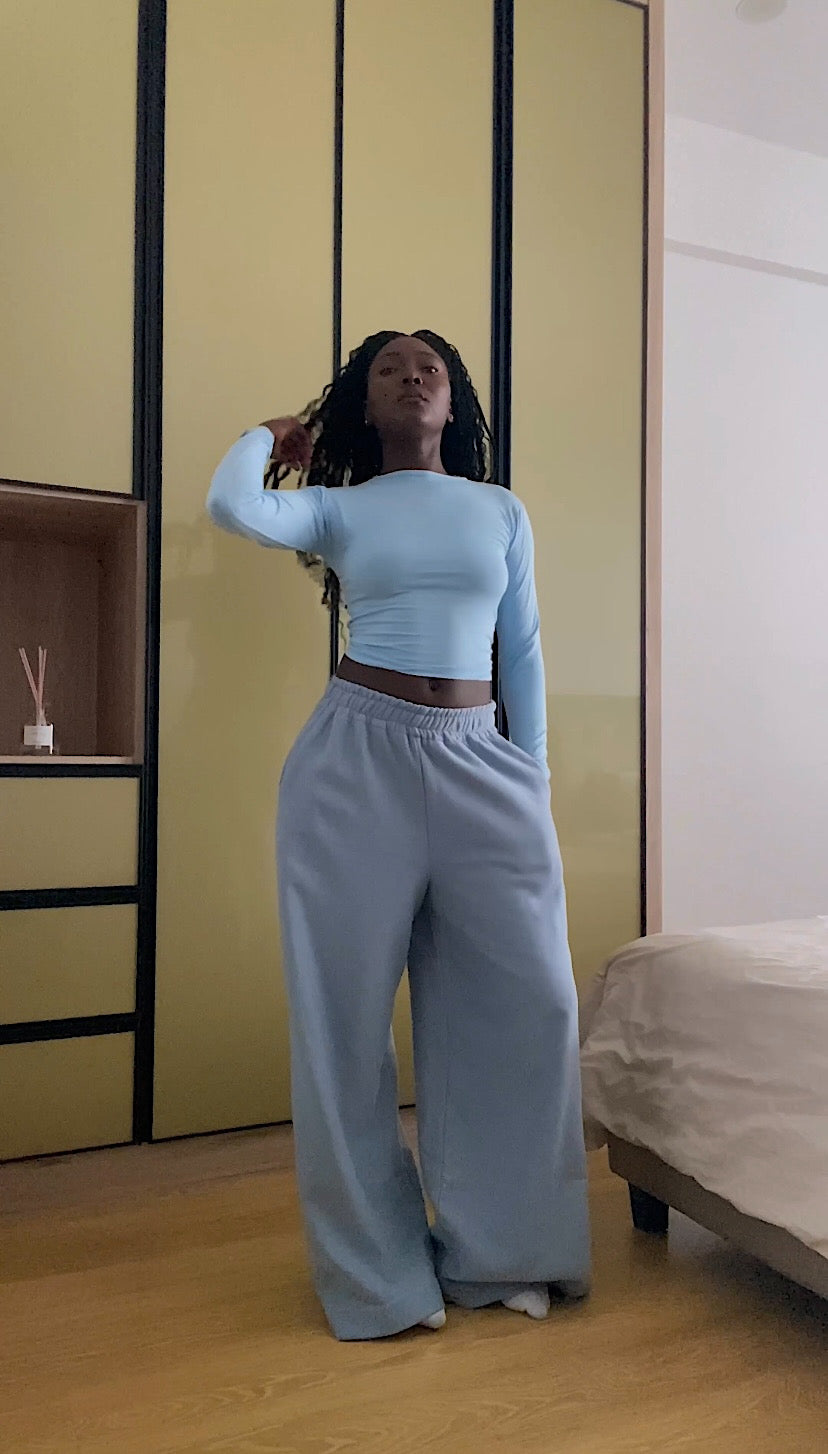 Pair them with any blue top from our Sea Collection or mix and match with any of our fitted pieces for a balanced, effortless look. Style with the matching Blue Cropped Zip-Up Hoodie for a tonal monochrome set—or zip it up for a sleek, jumpsuit-inspired vibe.