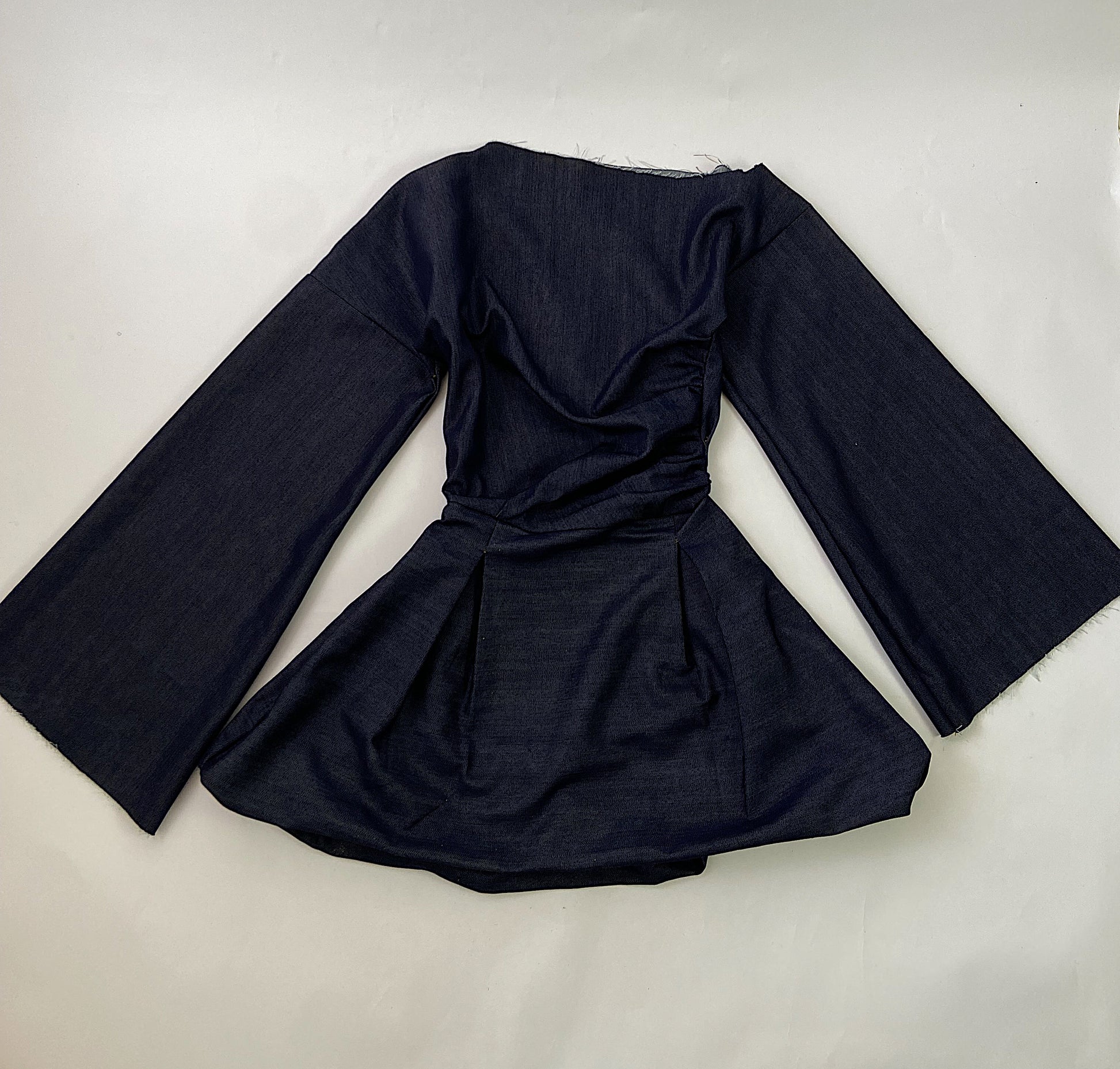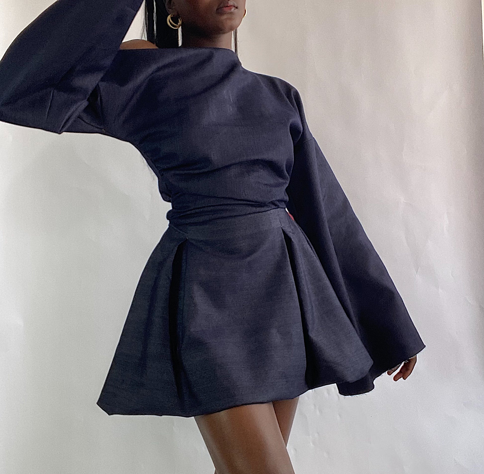 The neckline is left raw and unfinished, adding an edge that contrasts beautifully with the dramatic pleats and wide long sleeves. One sleeve subtly slips off the shoulder, designed to fall and drape with asymmetrical cool. The silhouette is cinched at the waist and flares into a full skater-style hem, balancing attitude with femininity.