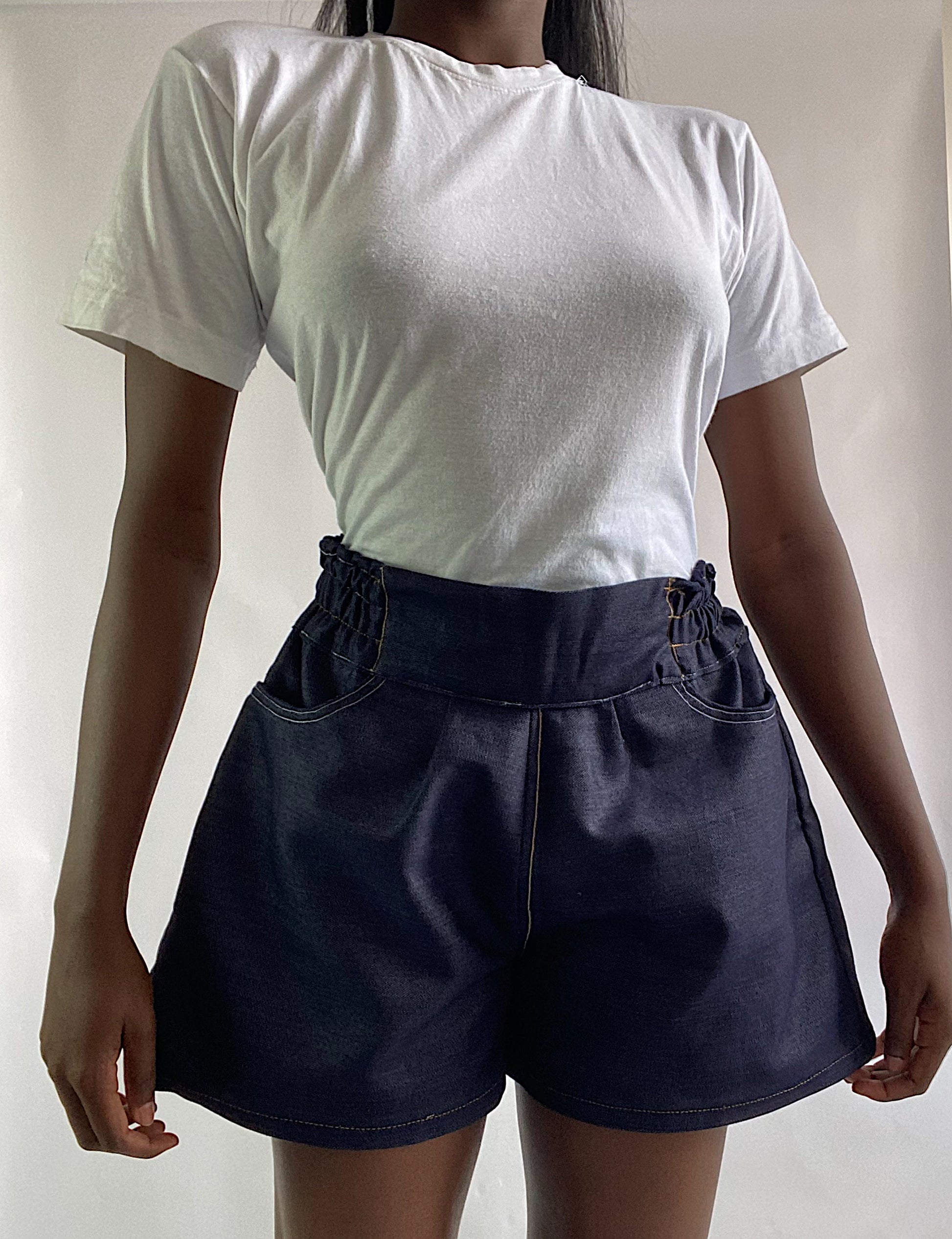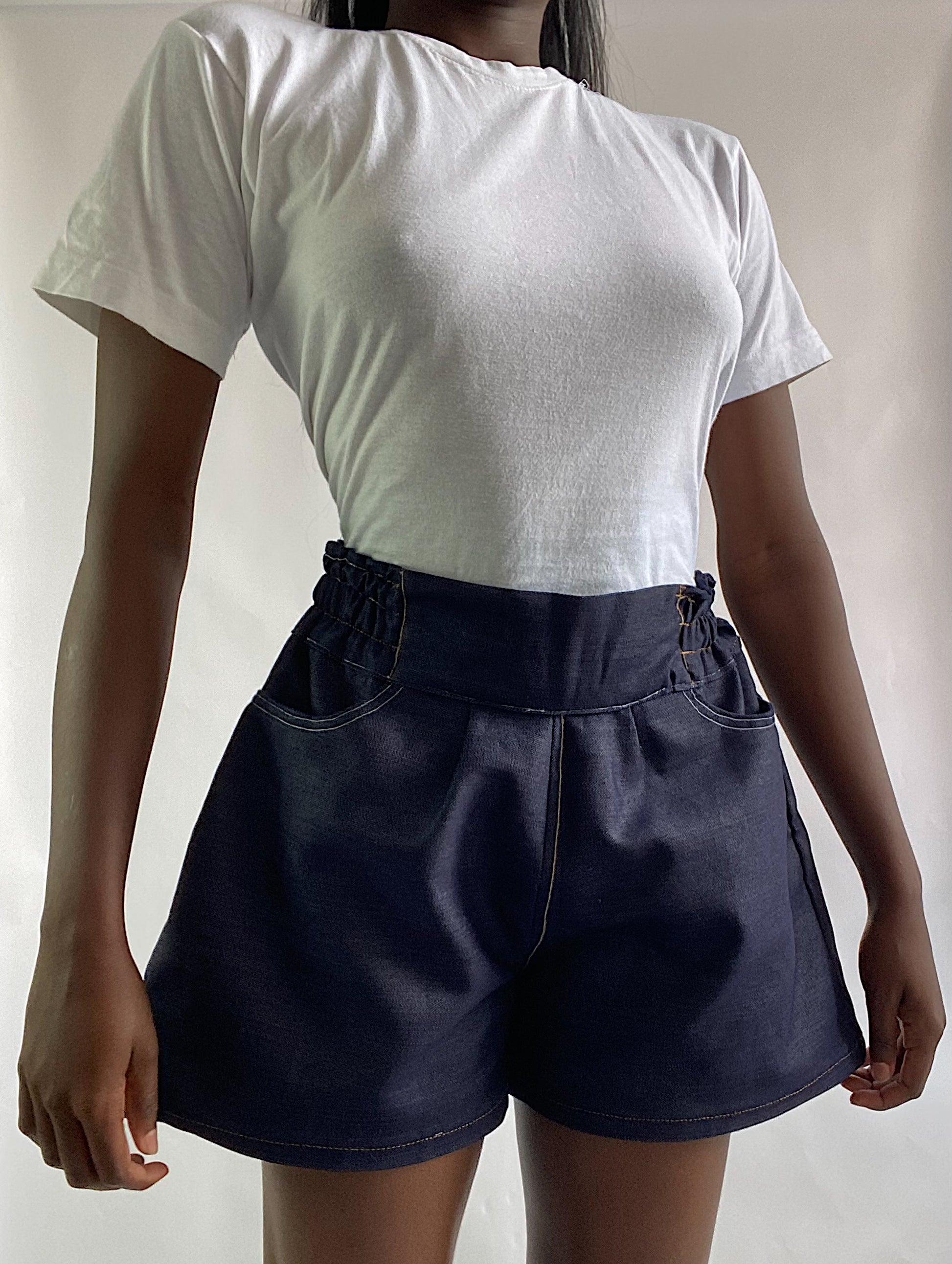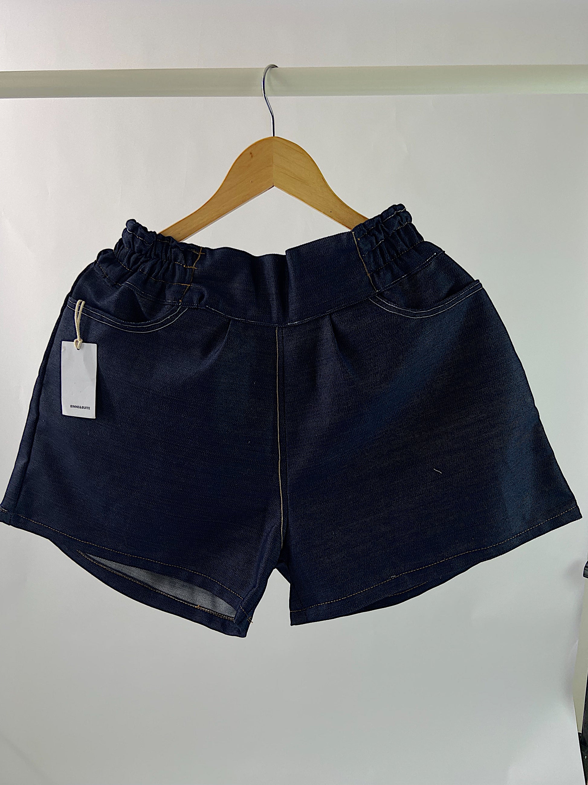 Designed with a skater-style silhouette and finished with a soft elastic waistband, these shorts blend structure with freedom. The flared hem adds a sense of motion and edge, while the deep indigo hue and contrast stitching tie it back to the collection’s architectural core.