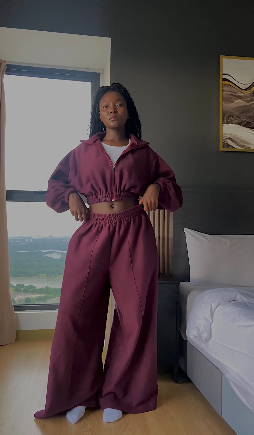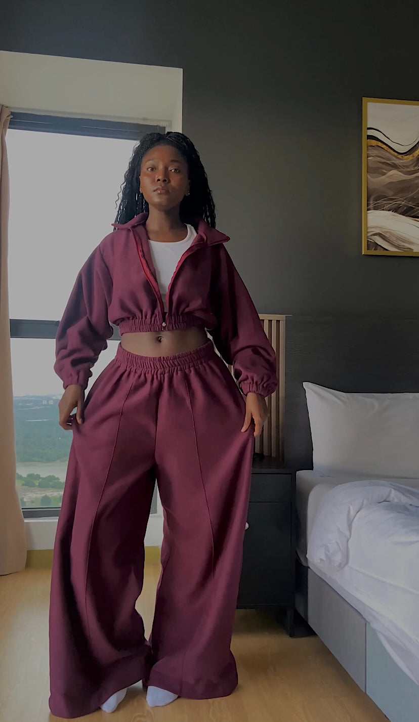 Perfect for traveling, casual outings, or elevated loungewear, these pants pair seamlessly with our Maroon Cropped Zip-Up Hoodie for a sleek, jumpsuit-inspired look or any of our fitted tees for an effortless everyday outfit.